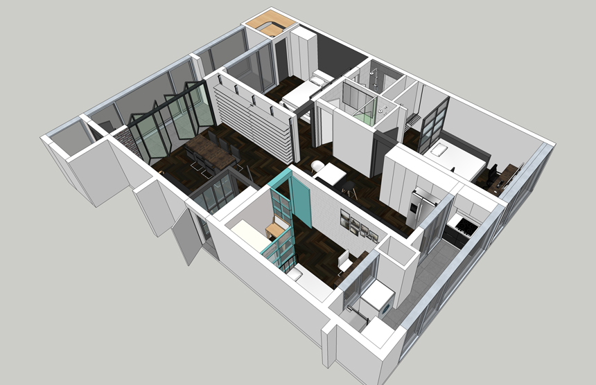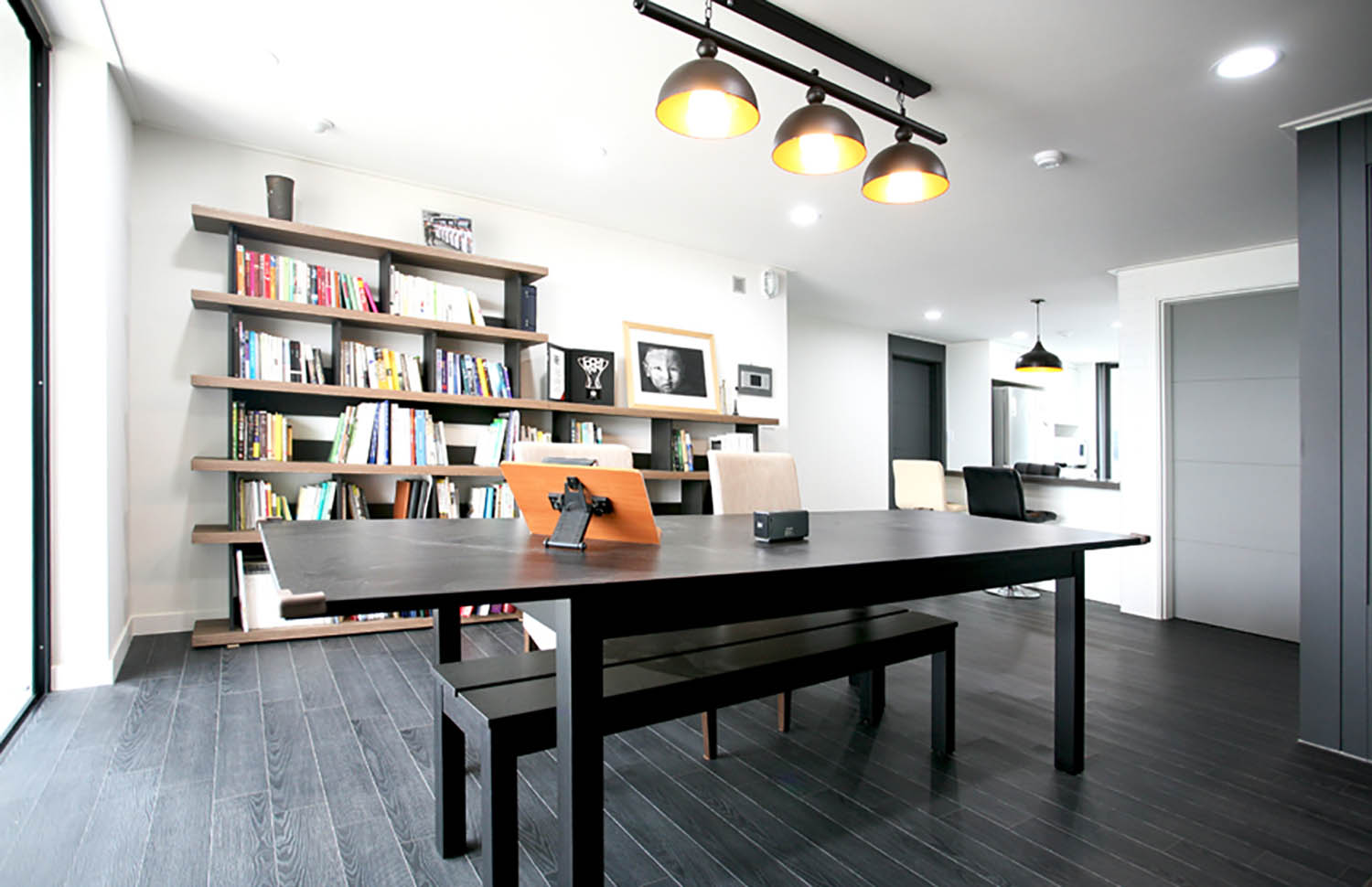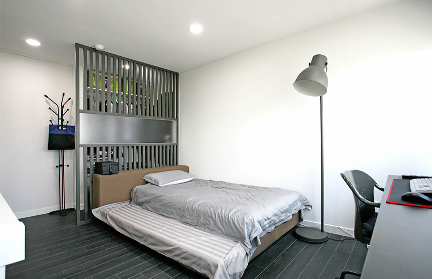 “거실에 TV를 없애주세요. 카페 같은 집이었으면 좋겠어요.” 처음 우리를 찾아온 건축주는 유니크한 삶을 원했다. 아들, 딸, 그리고 엄마, 세 식구가 살 이 집에는 거실 테이블 대신에 스터디 테이블을 놓고 TVTV 장식장 대신 책장을 놓고 싶어 했다. 우리는 우선 3개의 방을 각각의 집으로 방문을 나서면 만나는 거실 주방 등을 마당으로 정의했다. 그리고 세 사람의 성향의 맞게 테라스가 있는 카페 같은 인테리어를 했다.