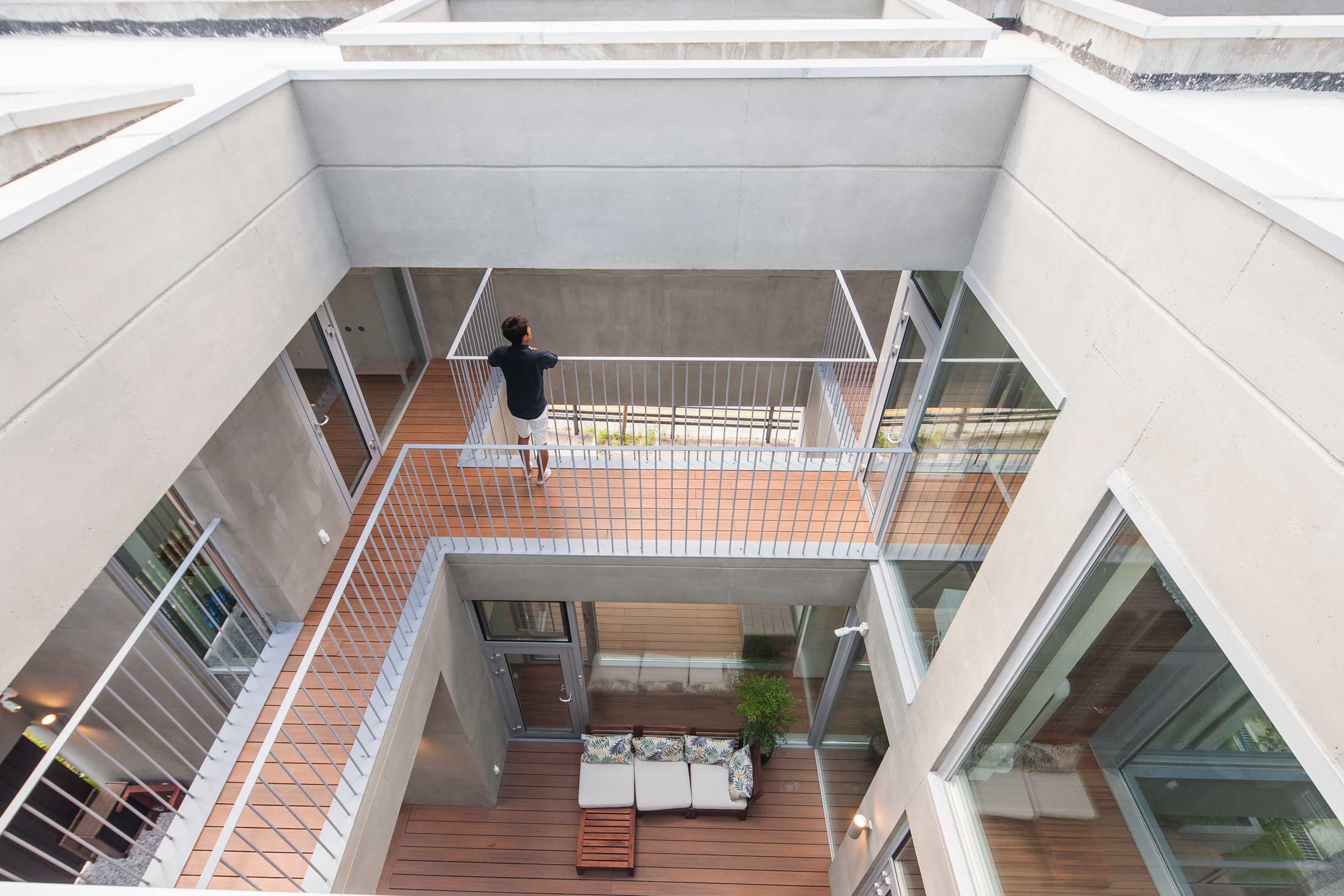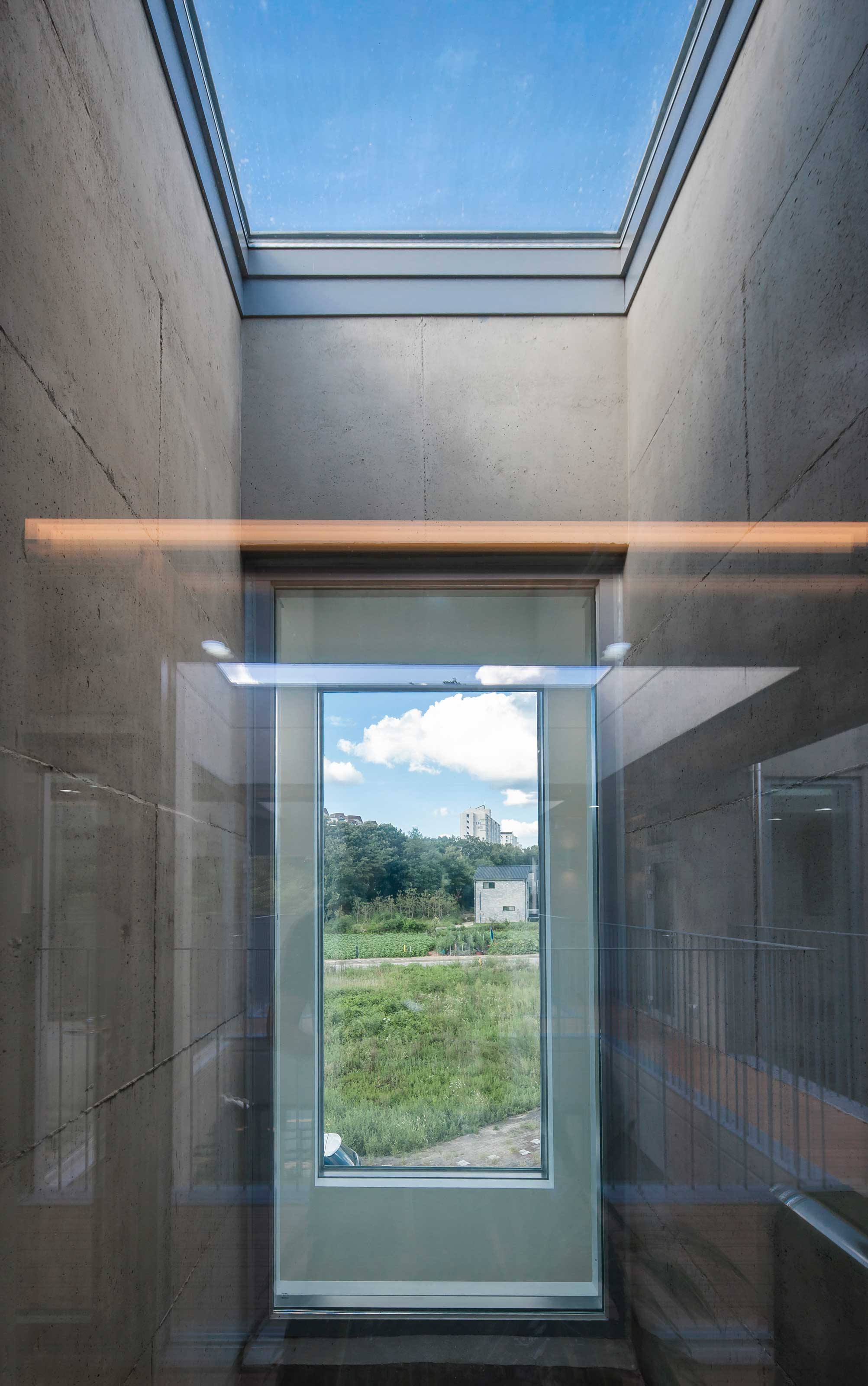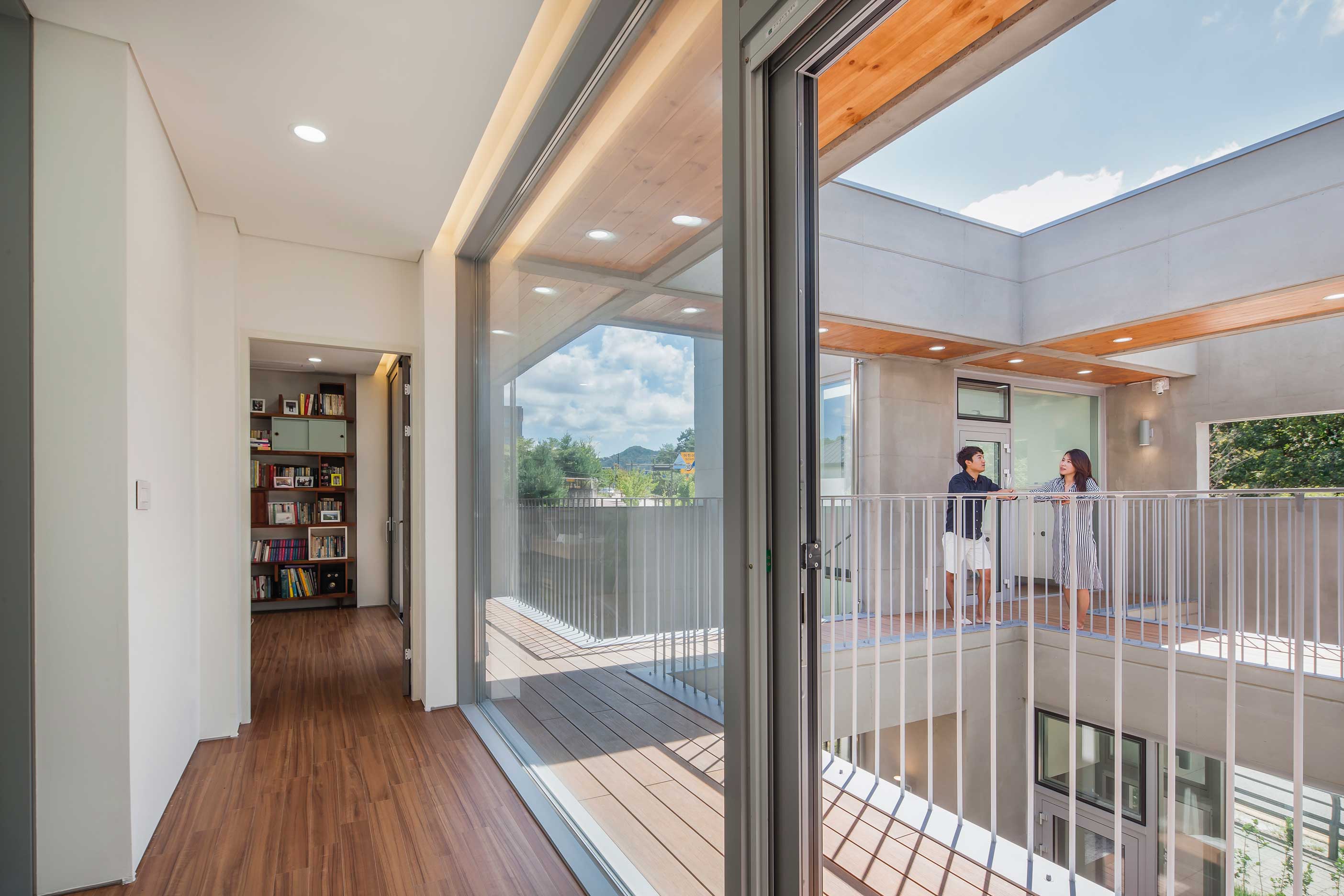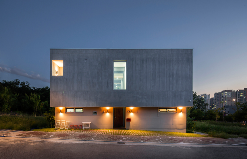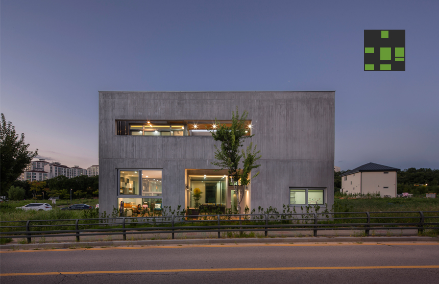 우주는 세상에 존재하는 모든 물질 · 공간 · 시간을 포괄하는 광범위한 단어이다. 한 가족의 물질과 시간, 그리고 공간이 담겨지는 집이라는 존재는 또 다른 하나의 작은 우주와도 같지 않을까? 우주라는 단어의 한자어가 宇(집우) 宙(집주)로 구성된다는 점은 우리의 생각에 더욱 의미를 부여해 준다. 우리는 13.4m X 13.4m의 정사각형의 작은 우주를 만들기로 하였고, 그 안에서 가족이라는 각각의 행성들이 다양하게 관계하고 그들의 시간들이 담겨지는 집이 되길 바랬다. 집은 그들만의 시공간이 담기는 작은 우주와도 같다고 생각했기 때문이다. 우리가 그동안 생활해온 공간은 항상 벽이라는 물질로 구분 되어져 왔고 그로 인해 규정되고 한정된 공간속에 개인의 이야기가 담겨져 왔다. 개인의 시간은 닫혀진 정육면체(방) 안에서만 흐르고 기억되어 온 것이다. 우리는 벽 대신에 공간과 공간사이를 또 다른 공간으로 나누기로 했다. 마치 우주의 무중력공간과도 같은 목적도 기능도 없는 비워진 무의 공간 말이다. 정확하게 단절된 벽과 달리 비워진 이 공간은 각각의 공간과 소통하며 개별 공간들 사이에 모호한 관계맺음을 제공한다. 시간은 공간과 공간을 흘러 다니며 다양한 이야기를 만들어 내고 함께 기억된다. 집을 구성하는 모든 공간이 마치 하나의 우주처럼 흘러가고 느껴지게 한다.