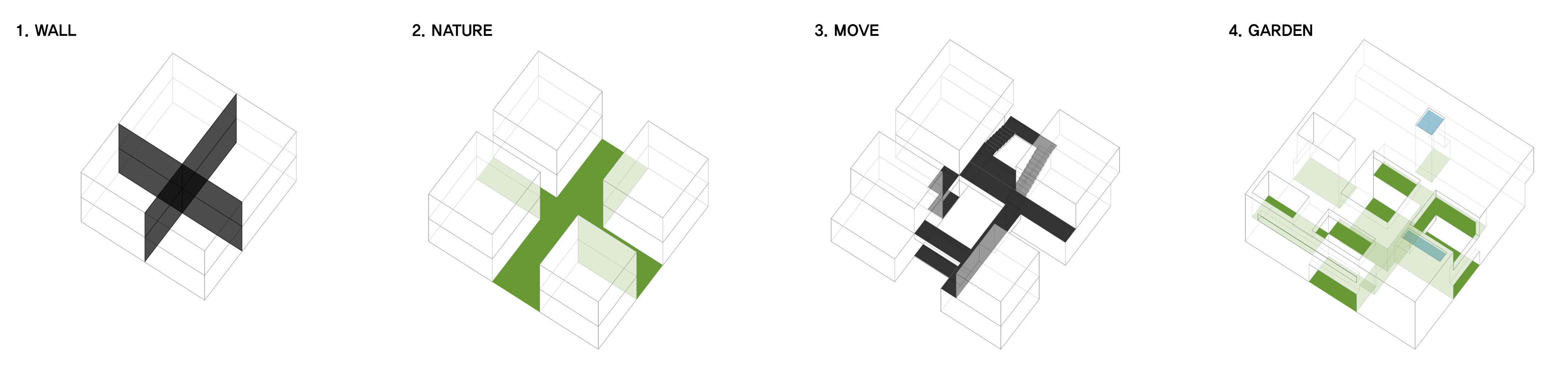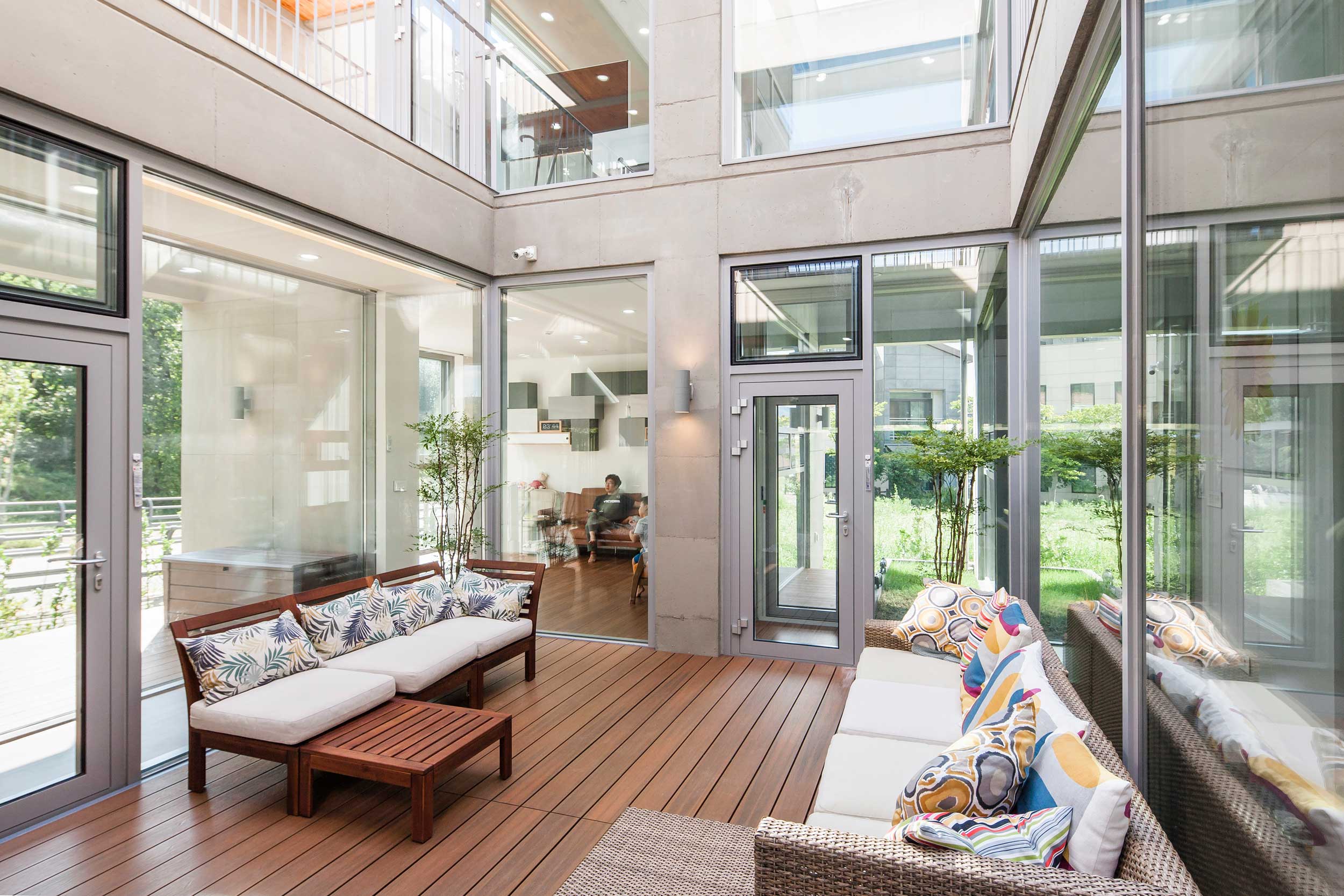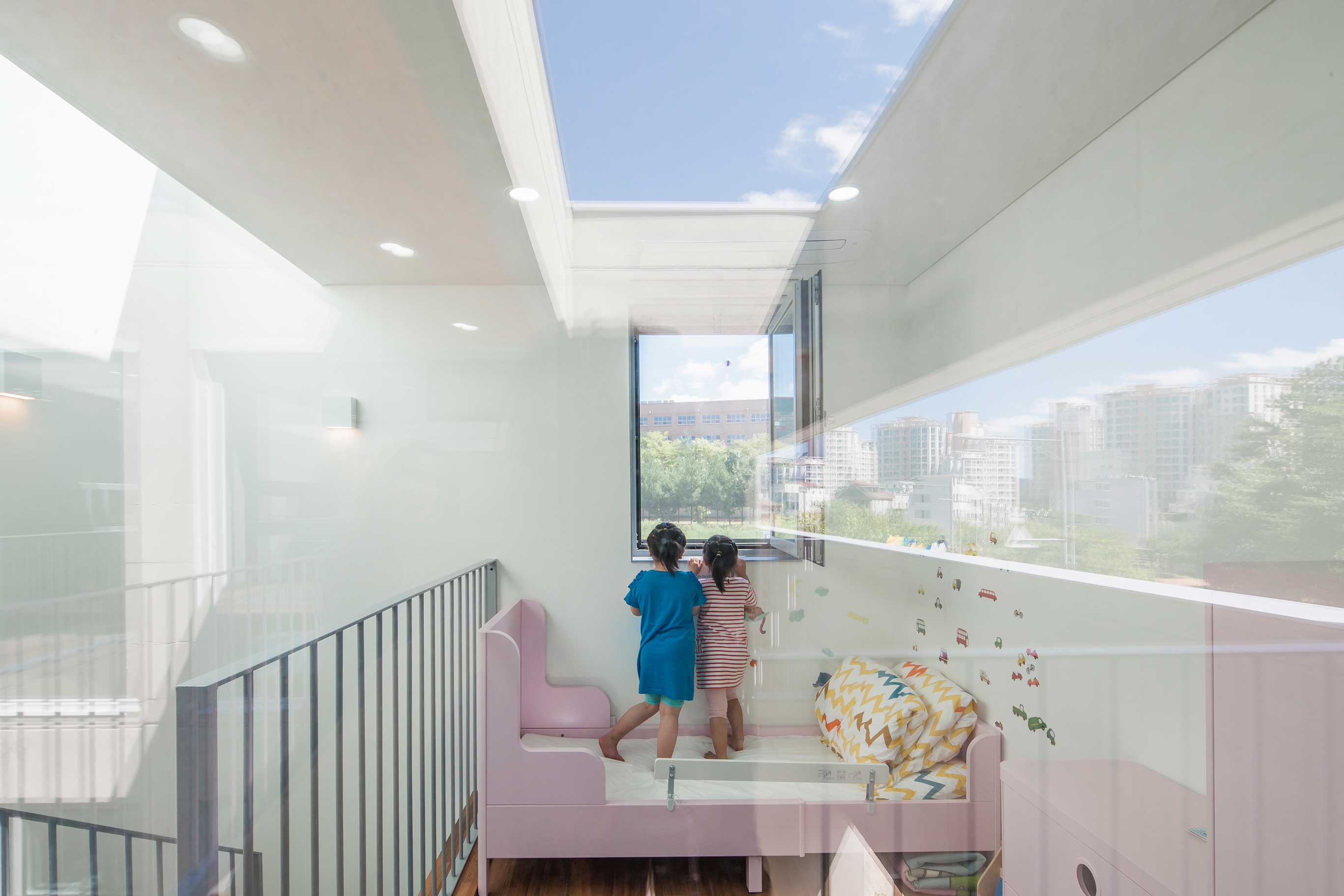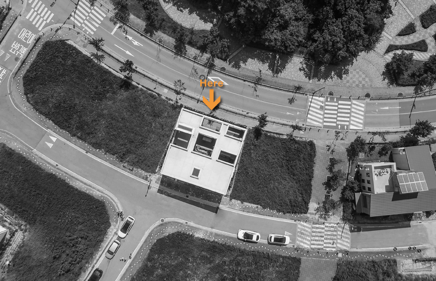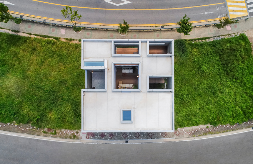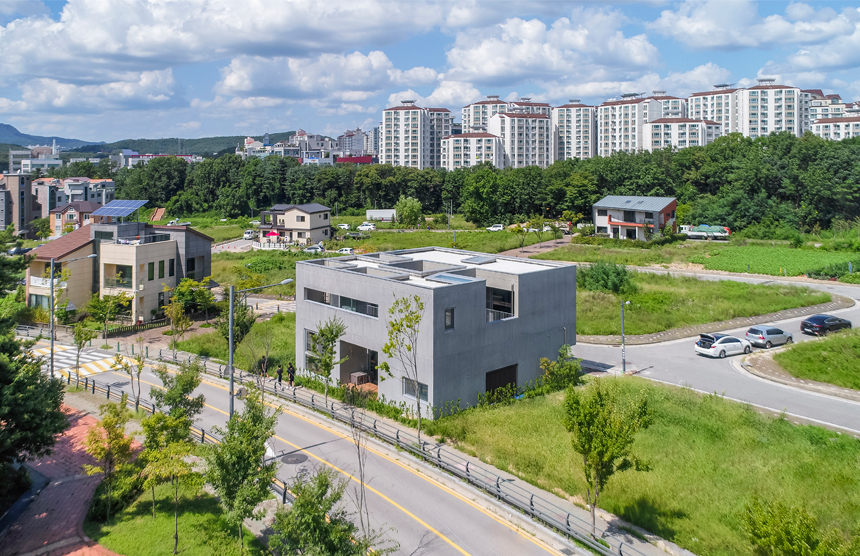 우주는 세상에 존재하는 모든 물질 · 공간 · 시간을 포괄하는 광범위한 단어이다. 한 가족의 물질과 시간, 그리고 공간이 담겨지는 집이라는 존재는 또 다른 하나의 작은 우주와도 같지 않을까? 우주라는 단어의 한자어가 宇(집우) 宙(집주)로 구성된다는 점은 우리의 생각에 더욱 의미를 부여해 준다. 우리는 13.4m X 13.4m의 정사각형의 작은 우주를 만들기로 하였고, 그 안에서 가족이라는 각각의 행성들이 다양하게 관계하고 그들의 시간들이 담겨지는 집이 되길 바랬다. 집은 그들만의 시공간이 담기는 작은 우주와도 같다고 생각했기 때문이다. 우리가 그동안 생활해온 공간은 항상 벽이라는 물질로 구분 되어져 왔고 그로 인해 규정되고 한정된 공간속에 개인의 이야기가 담겨져 왔다. 개인의 시간은 닫혀진 정육면체(방) 안에서만 흐르고 기억되어 온 것이다. 우리는 벽 대신에 공간과 공간사이를 또 다른 공간으로 나누기로 했다. 마치 우주의 무중력공간과도 같은 목적도 기능도 없는 비워진 무의 공간 말이다. 정확하게 단절된 벽과 달리 비워진 이 공간은 각각의 공간과 소통하며 개별 공간들 사이에 모호한 관계맺음을 제공한다. 시간은 공간과 공간을 흘러 다니며 다양한 이야기를 만들어 내고 함께 기억된다. 집을 구성하는 모든 공간이 마치 하나의 우주처럼 흘러가고 느껴지게 한다.