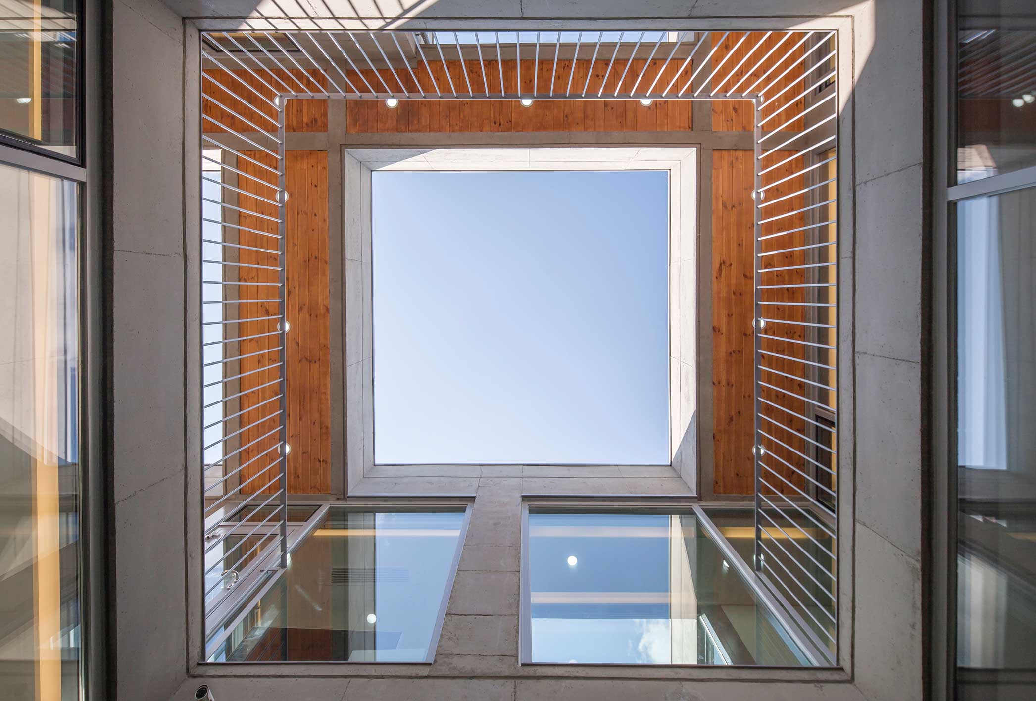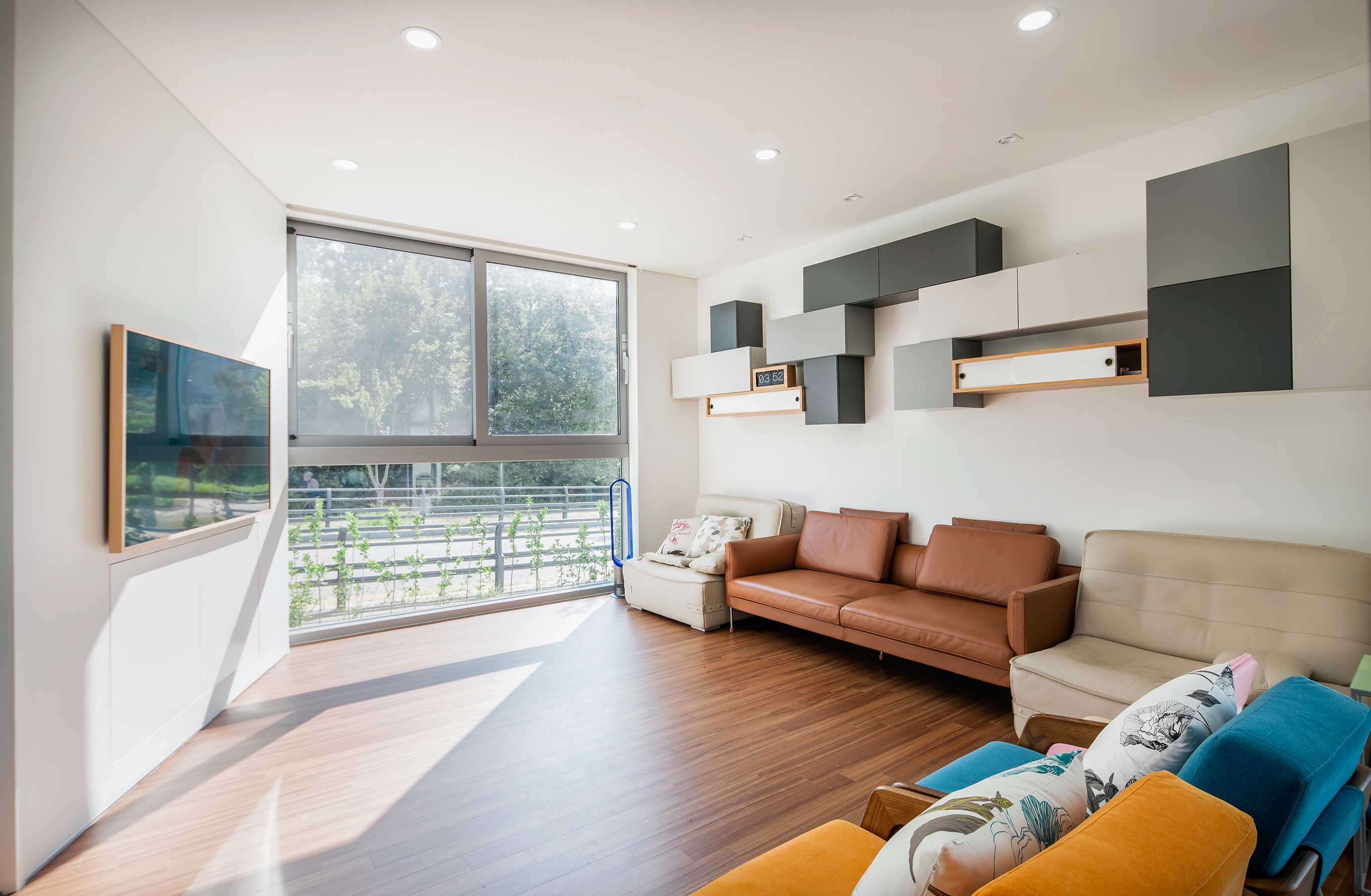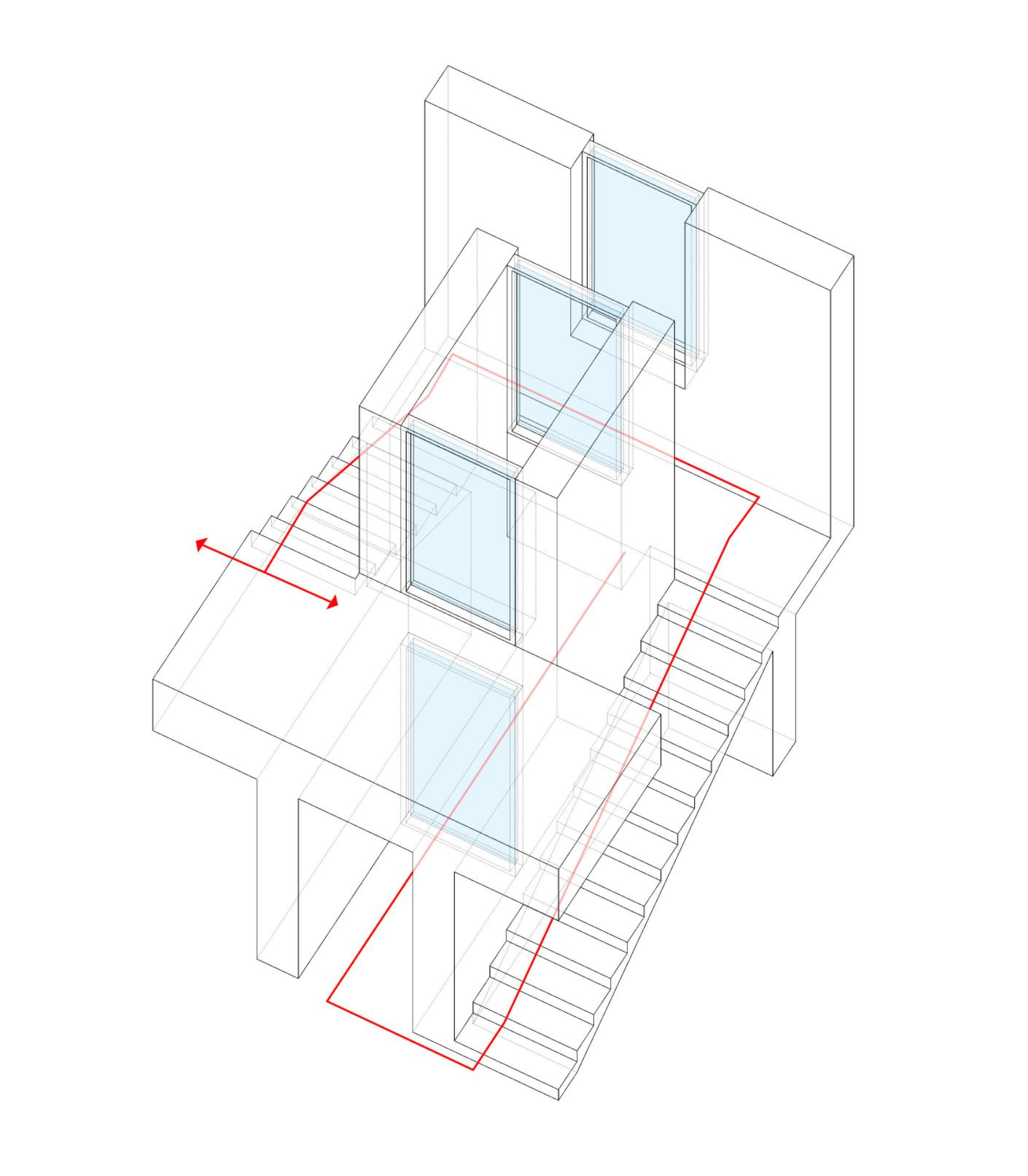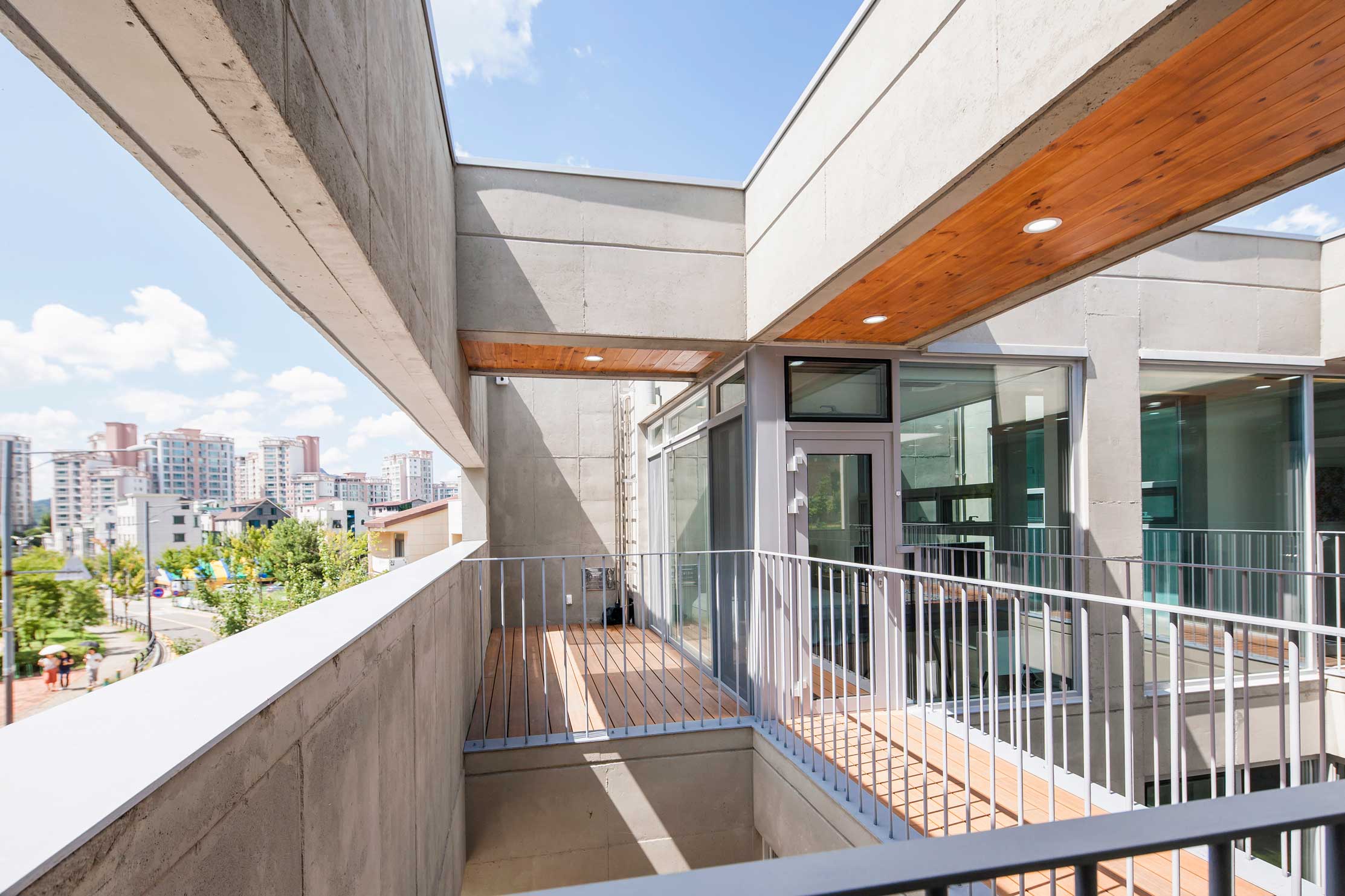 우주는 세상에 존재하는 모든 물질 · 공간 · 시간을 포괄하는 광범위한 단어이다. 한 가족의 물질과 시간, 그리고 공간이 담겨지는 집이라는 존재는 또 다른 하나의 작은 우주와도 같지 않을까? 우주라는 단어의 한자어가 宇(집우) 宙(집주)로 구성된다는 점은 우리의 생각에 더욱 의미를 부여해 준다. 우리는 13.4m X 13.4m의 정사각형의 작은 우주를 만들기로 하였고, 그 안에서 가족이라는 각각의 행성들이 다양하게 관계하고 그들의 시간들이 담겨지는 집이 되길 바랬다. 집은 그들만의 시공간이 담기는 작은 우주와도 같다고 생각했기 때문이다. 우리가 그동안 생활해온 공간은 항상 벽이라는 물질로 구분 되어져 왔고 그로 인해 규정되고 한정된 공간속에 개인의 이야기가 담겨져 왔다. 개인의 시간은 닫혀진 정육면체(방) 안에서만 흐르고 기억되어 온 것이다. 우리는 벽 대신에 공간과 공간사이를 또 다른 공간으로 나누기로 했다. 마치 우주의 무중력공간과도 같은 목적도 기능도 없는 비워진 무의 공간 말이다. 정확하게 단절된 벽과 달리 비워진 이 공간은 각각의 공간과 소통하며 개별 공간들 사이에 모호한 관계맺음을 제공한다. 시간은 공간과 공간을 흘러 다니며 다양한 이야기를 만들어 내고 함께 기억된다. 집을 구성하는 모든 공간이 마치 하나의 우주처럼 흘러가고 느껴지게 한다.