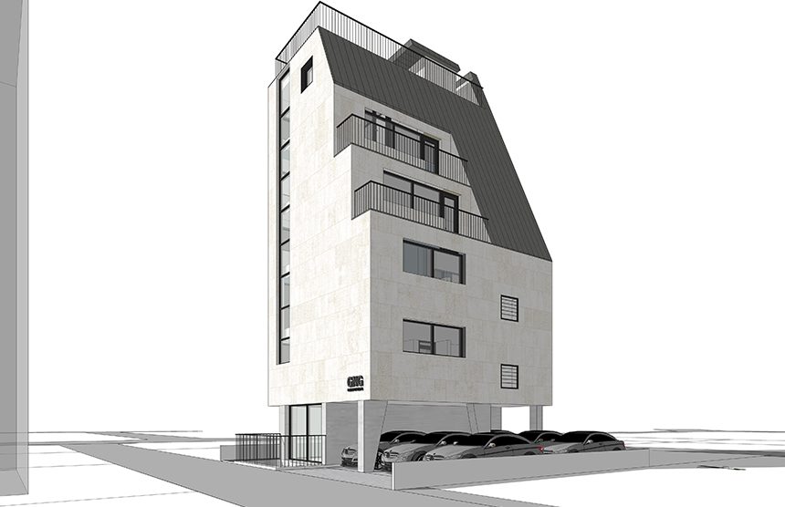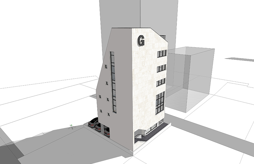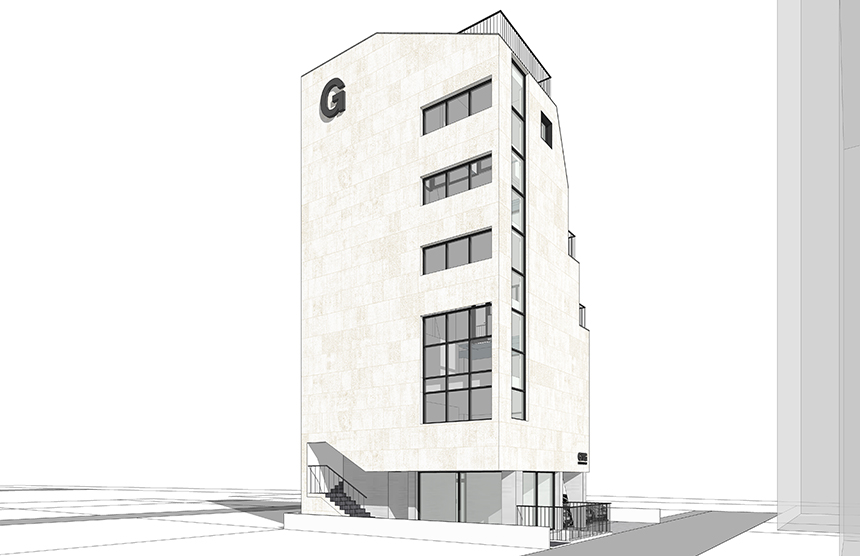 업무시설로써 효율적 공간 활용을 위한 배치와 용적률을 최대로 사용하는 디자인에 중점을 두고 진행했다. 지상1층은 주차 6대를 할 수 있는 공간과 그 외 면적을 활용한 상가, 지상2층부터 5층까지는 업무공간, 지상6층은 대표이사 등 임원 3명이 사용할 공간으로 구성하였다. 더불어 공사비를 고려하여 지하층의 면적은 가급적 건물의 외곽선에서 벗어나지 않도록 했다.