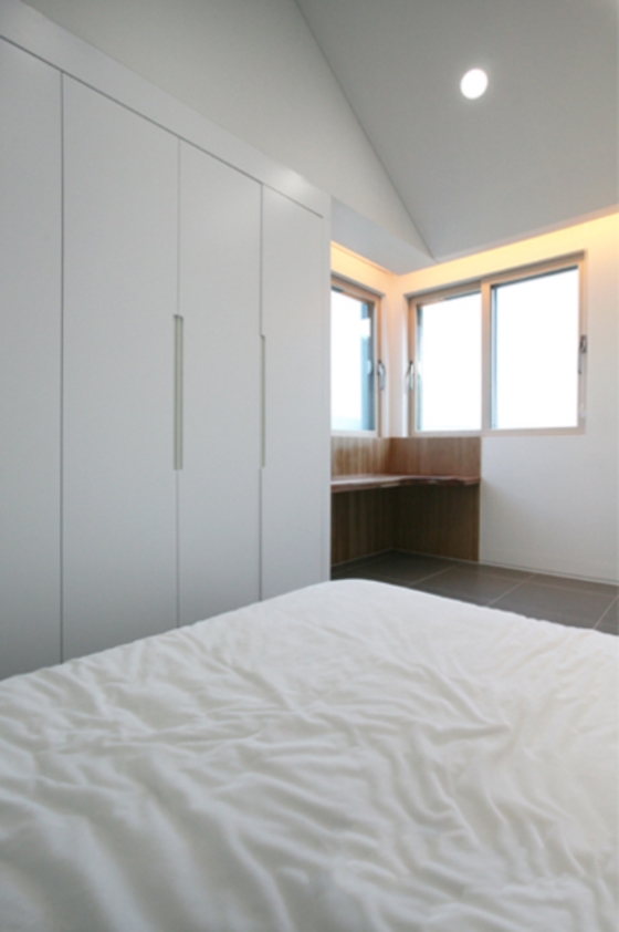 1층 주방과 연결되는 외부공간은 추후 확장성을 고려, 외부정원으로 꾸며 기능과 심미성을 동시에 만족시킬 수 있는 계획을 했으며, 장성한 자녀가 집을 방문할 때 편하게 지낼 수 있도록 만든 2층은, 창을 통해 트인 풍경이 들어오는 거실을 중심으로 2개의 침실을 배치하였다. 특히 2층 거실은 좌측 벽면은 화이트 오크 집성 각재를 세로로 배치하여 좀 더 천장이 높고, 공간이 넓게 느껴지도록 디자인했다.