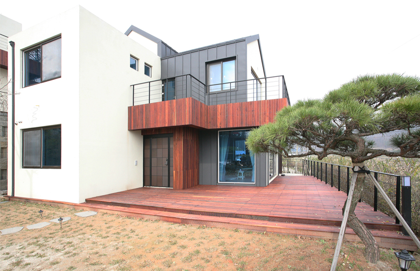 1층 주방과 연결되는 외부공간은 추후 확장성을 고려, 외부정원으로 꾸며 기능과 심미성을 동시에 만족시킬 수 있는 계획을 했으며, 장성한 자녀가 집을 방문할 때 편하게 지낼 수 있도록 만든 2층은, 창을 통해 트인 풍경이 들어오는 거실을 중심으로 2개의 침실을 배치하였다. 특히 2층 거실은 좌측 벽면은 화이트 오크 집성 각재를 세로로 배치하여 좀 더 천장이 높고, 공간이 넓게 느껴지도록 디자인했다.