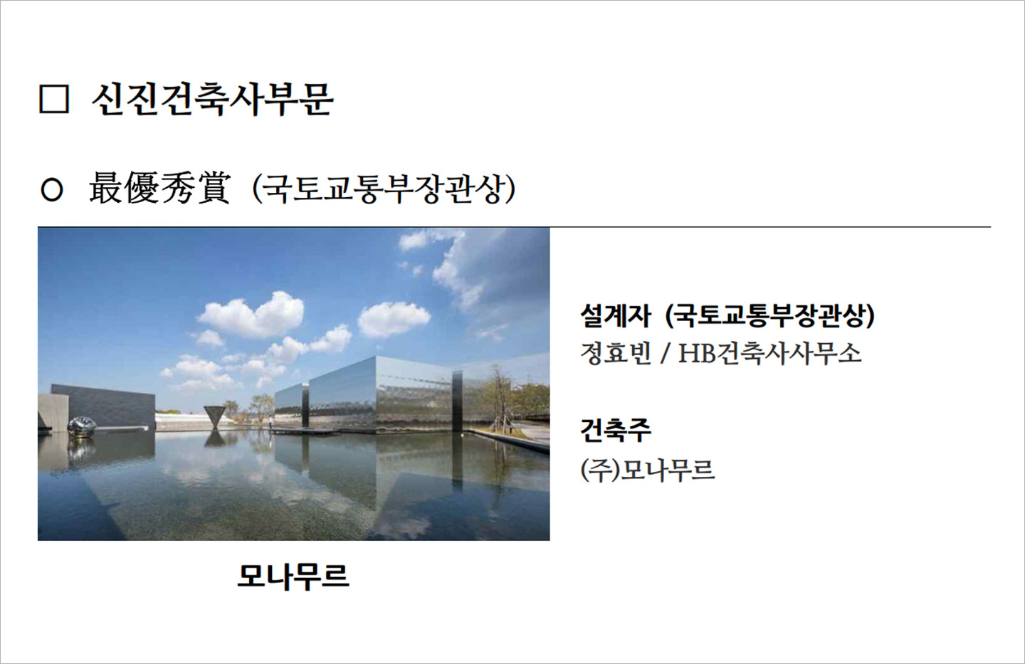 Architect History All Residential Commercial Office Public Etc All Event Media Prize Board [2020 한국건축문화대상] 최우수상_모나무르 (신진건축사부문) news/prize by HB건축사사무소 2021. 1. 27. HB건축사사무소에서 설계 감리한 모나무르가 2020년 한국건축문화대상 신진건축사부문 최우수상을 수상하였습니다. 신진건축사 화이팅!! 고생하신 모든 분들 감사드립니다^^ 공유하기 게시글 관리 HB건축사사무소 관련글 [당선] 부산교육역사체험관 리모델링 설계공모 [우수상] 부산예술학교 기숙사 증축 및 리모델링 설계공모 [입상] 주례열린도서관 건립 설계공모 [입상] 의성문화원 건립사업 설계공모 댓글