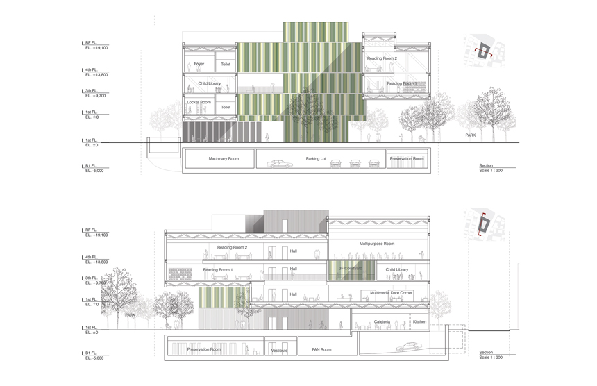 우리의 대안은 도서관의 영역성을 강조하기보다 정보와 반응하는 공원이고자 한다. 이는 이미 이 지역의 대부분 공간이 주거단지, 대형시설 그리고 공공시설등에 의해 큰 경계들로 채워져 있기 때문이다. 우리의 제안은 채워진 매스보다 비워내는 공간을 중심으로 구성된다. 기존의 open space와 공원의 기능을 존중하고 이와 반응하는 공공도서관을 제안한다. 상대적으로 부족한 이 지역의 openspace의 범위와 밀도는 지역의 문화, 소통의 활동을 저해하는 원인이 된다. 주어진 대지의 publice open space에 닫혀진 공공시설이 아닌 열려진 공공공간을 제안하고 다양한 활동을 유발 할 수 있는 문화 도서관을 만들고자 한다. 우리가 제안하는 open plan은 다변화 하는 커뮤니티 공간으로 변화하는 도서관의 기능에 가장 적극적으로 반응 한다. public open space와 공존하는 도서관의 open plan은 다양한 공공도서관의 프로그램에 유연하게 반응한다. 공공도서관은 보고 읽는 단편적 활동 뿐아니라 말하고 듣고 움직이는 다양한 형식의 정보활동이 발생하는 공간이어야 한다.
