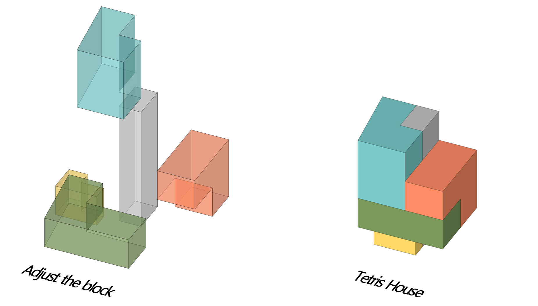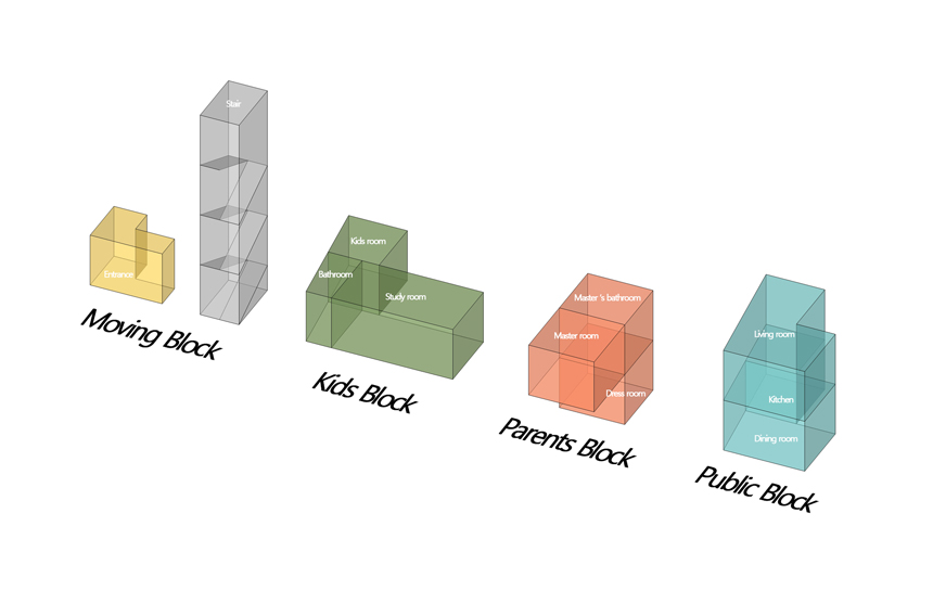 점점 과밀화되어가는 현대 도시에서의 주거형식은 최근 들어 다양하게 변화해 가고 있다. 그중의 하나가 협소주택이다. 협소주택의 가장 큰 특징은 사용자에게 필요한 건축프로그램이 수평적으로 구성되기 어려운 협소한 대지면적에 있다. 현재 수많은 협소주택은 프로그램을 수직적으로 적층 하거나, 스킵플로어 형식으로 양분하는 방식이 많이 행해지고 있다. 우리의 제안은 좁은 면적에서 더 작게 모듈을 나누고 그러한 모듈의 조합을 통해 더 다양한 프로그램 형태를 만드는 것이다. 수평과 수직으로 모듈을 조합하여 마치 테트리스 게임의 블록들처럼 다양한 공간의 형태와 구성을 만드는 것이다. 그리고 블록들 상호 간의 관계성과 형태에 따라 가장 효율적인 조립방법을 연구하였다. 이러한 방식은 비단 단독주택뿐만 아니라 공동주택에도 적용 가능할 대안으로 우리는 생각하고 있다.