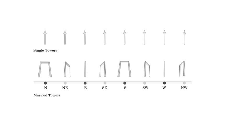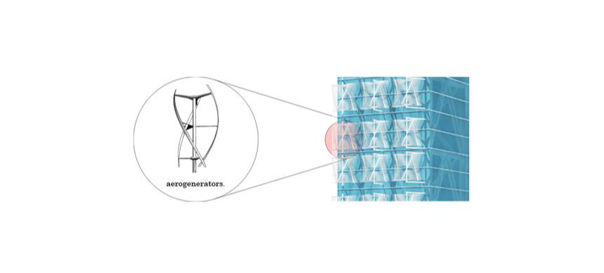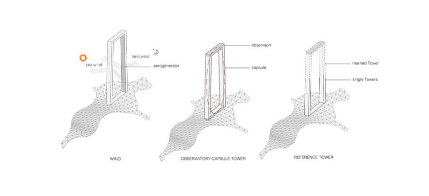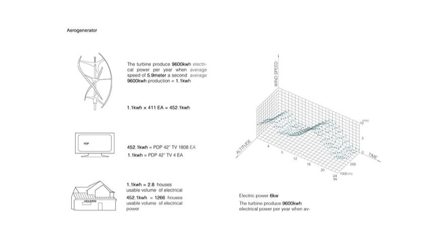 First, the tower changes according to the weather condition. It looks like one tower in the clear days because the north and the south tower are connected. In the cloudy days, however, it looks like two separate towers. Second, the aerogenerators will look differently according to the wind speed of the day or the height. This will create the various facade of the tower. Third, the tower will works as a navigation. The tower looks different according to the viewer's location, and gives people a sense of their relative location in the city.