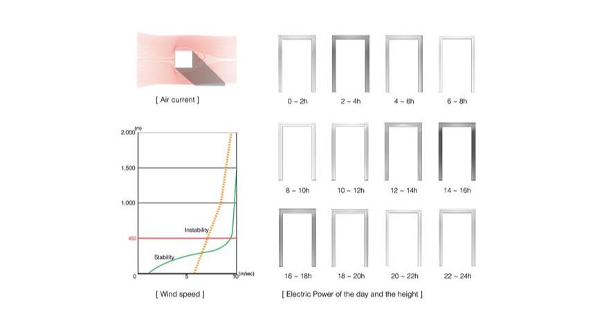 The rectangular windowshaped tower represents the image of a "Window Open to the World." Since the tower is located at the seashore, there are sea breezes during the daytime and land breezes at night. The wind speed at the top of the tower, which is at the height of 450m and above, is almost four times faster than the wind speed at the ground level. This environment provides a great location for the wind power plant. The 411 aerogenerators will create the electricity necessary to the tower and other facilities, and also will enable us to experience the invisible natural phenomenon of the wind through the rotating aerogenerators.