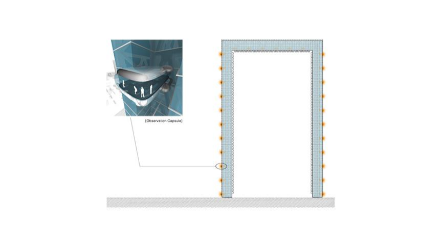 Visitors will use the ongoing-circulating glass capsule for the transportation. These capsules circulate clock wise like a Ferris wheel. The observatory is located at the top floor horizontally to maximize the floor area. As a transportation system, glass capsules are circulating along the tower. Visitors get on the capsule at the basement level. The capsule in the north tower goes up to view the northern scenery including the city of Gesung in the North Korea. When visitors get off at the top floor, they enjoy the surrounding view and use facilities such as a cocktail lounge and restaurants. Then they take the capsule again and go down the south tower while enjoying the view. The capsule penetrates the lake water and reaches to the platform at the basement. This circulating glass capsule will be a glowing rotating beacon of the city of Cheongna.